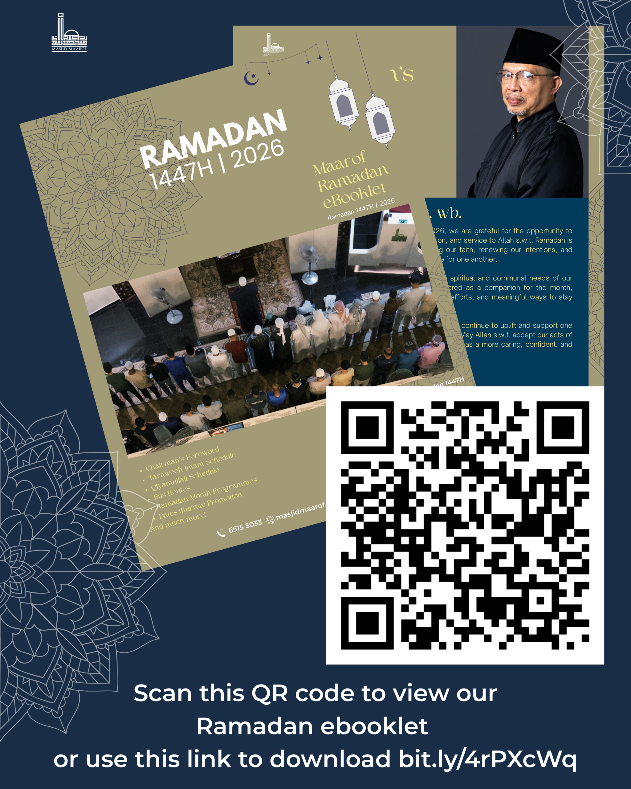 At Maarof Mosque, we commit to provide quality services at every level so as to nurture a community that is compassionate and strives for excellence. Through exposing various facets and knowledge of Islam, we seek to be a Tech-Hive of Knowledge Driven by Excellence in Conduct, while incorporating values like Wisdom, Integrity, Kindness, Inclusiveness and Steadfastness into our work.