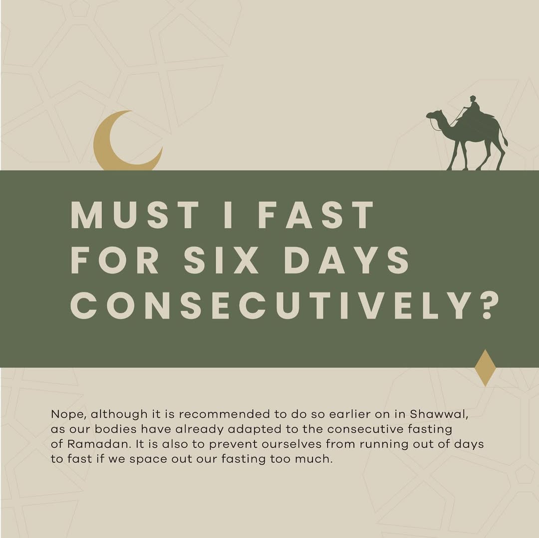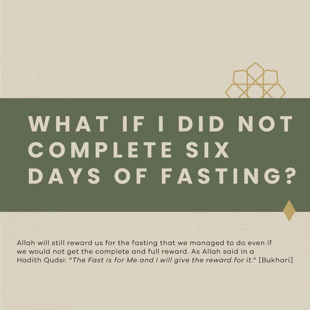 “Whoever fasts during the month of Ramadan and then follows it with six days of Shawwal will be (rewarded) as if he had fasted the entire year.” [Muslim]